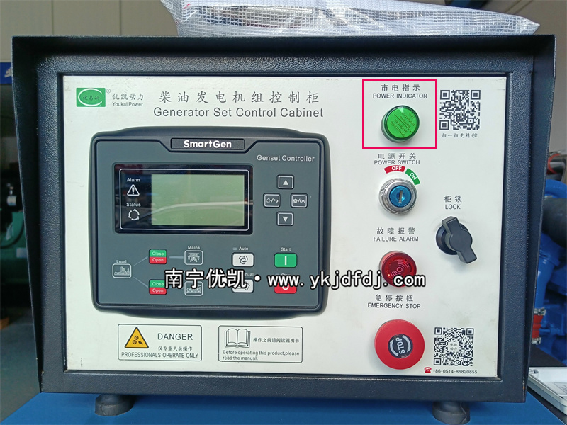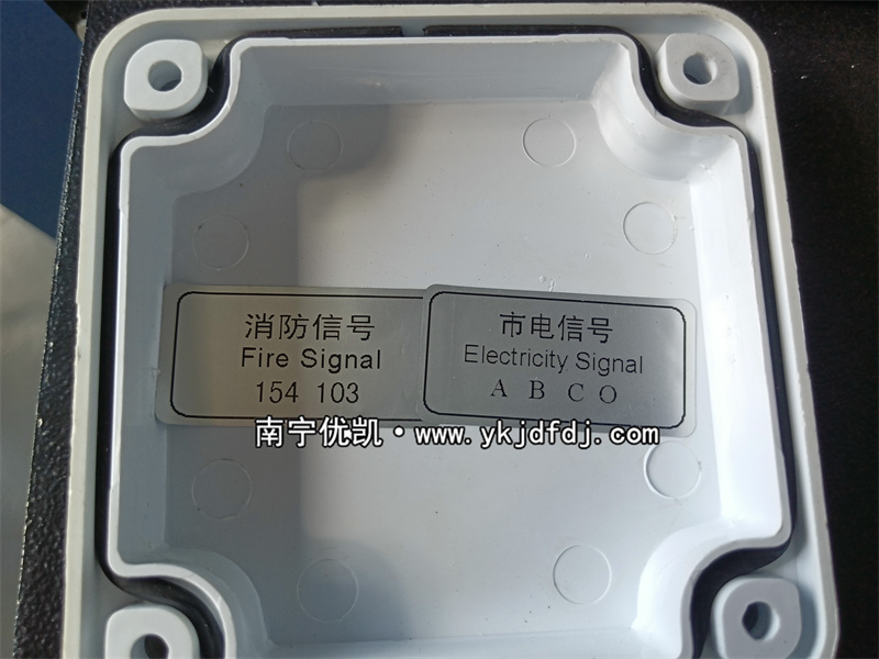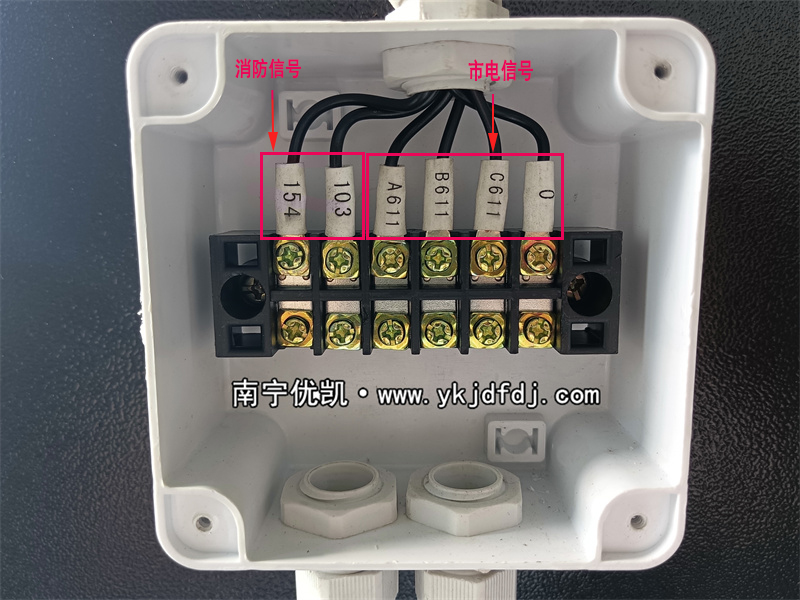 1、優(yōu)凱動力生產(chǎn)的柴油發(fā)電機組在控制箱右側(cè)有一個信號接線盒,里面有消防信號(154、103)和市電信號(A、B、C、0),380V,三相四線