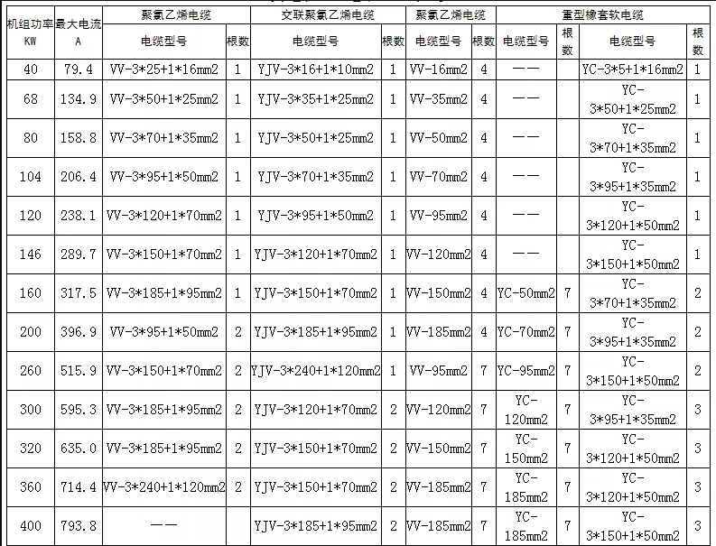 (這是理論數(shù)據(jù),實(shí)際使用時(shí)還要根據(jù)實(shí)際情況而定。結(jié)合電纜的長(zhǎng)度,電纜廠家的標(biāo)準(zhǔn)等。)有這樣的案例我們可以以此類推得出多大功率的柴油發(fā)電機(jī)該使用多大的電纜了。