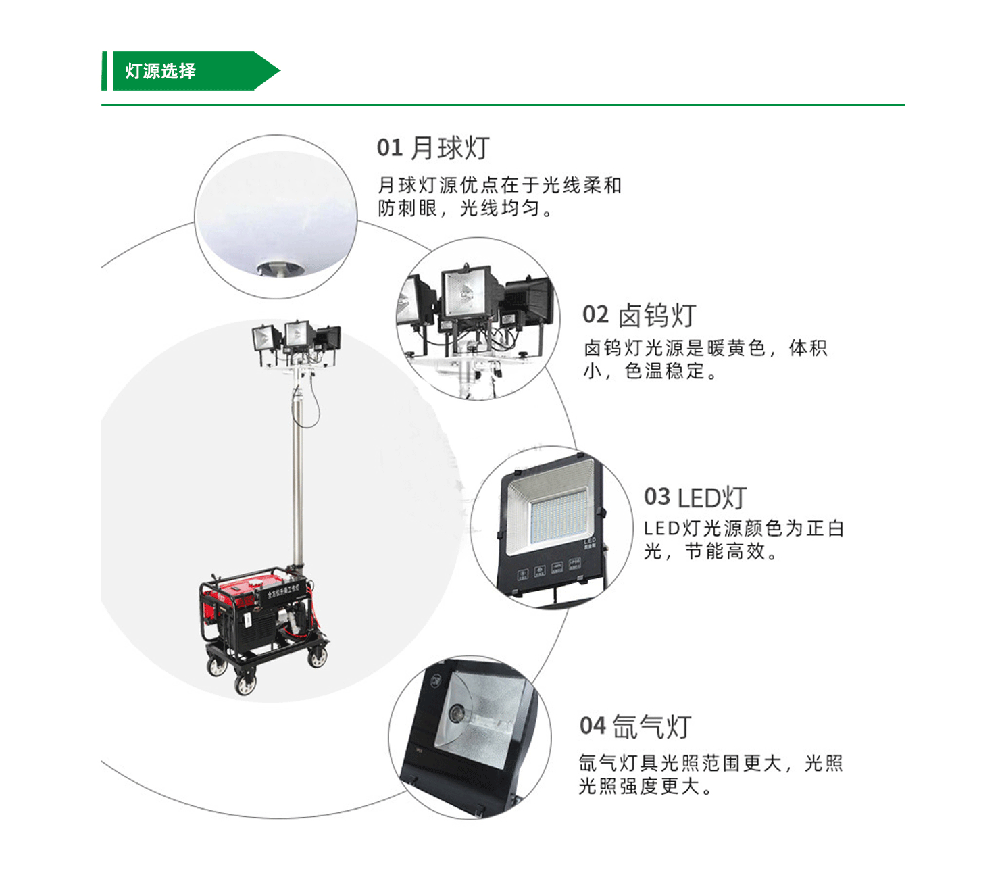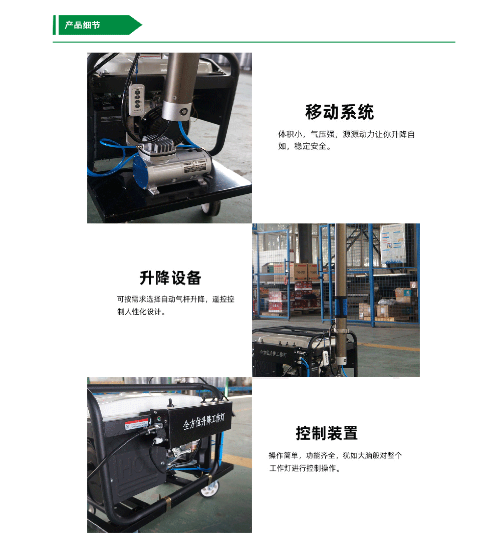 整套設(shè)備結(jié)構(gòu)合理、操作方便,自帶發(fā)電機,自動升降,外表精細、升降平穩(wěn),啟動快,在緊急情況下可以隨時點亮燈具,實現(xiàn)照明。