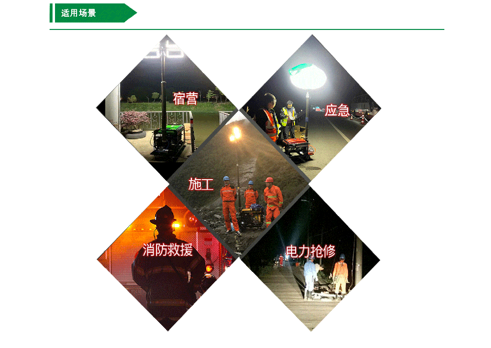各種夜間作業(yè)如大型施工、工程搶修、災(zāi)情搶險、消防照明、警案現(xiàn)場、交通拯救、事故處理和廣告拍攝等場合,滿足了現(xiàn)場對大面積、高亮度照明的需求。